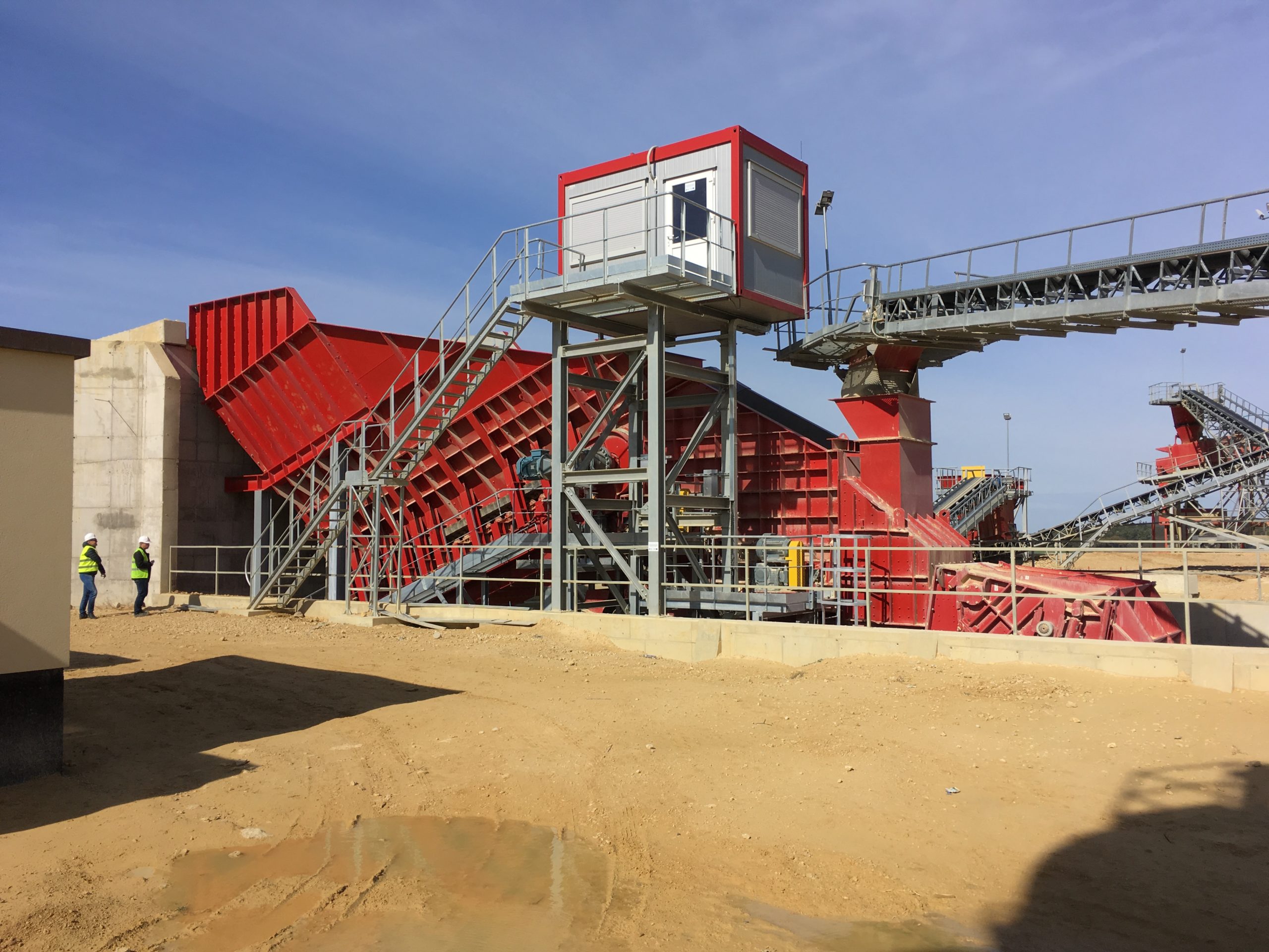 Schwere Buckelplattenbänder vom Typ BPB-SF werden vorzugsweise unter Kippstellen angeordnet und transportieren ungebrochene Rohmaterialien wie zum Beispiel Kalkstein und Naturgips mit Kantenlängen von bis zu 1.500 mm zur Brecheranlage.