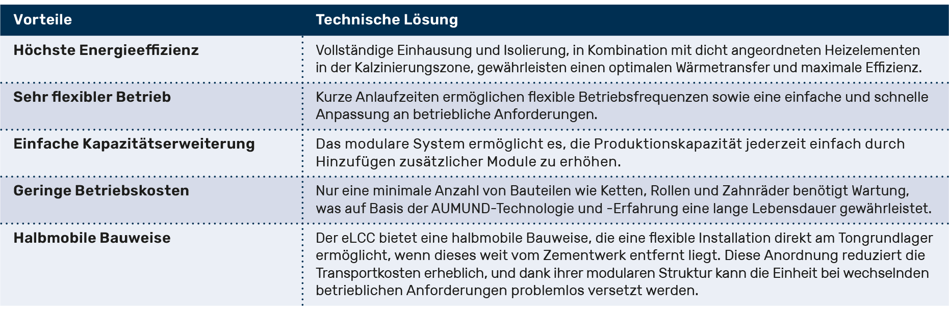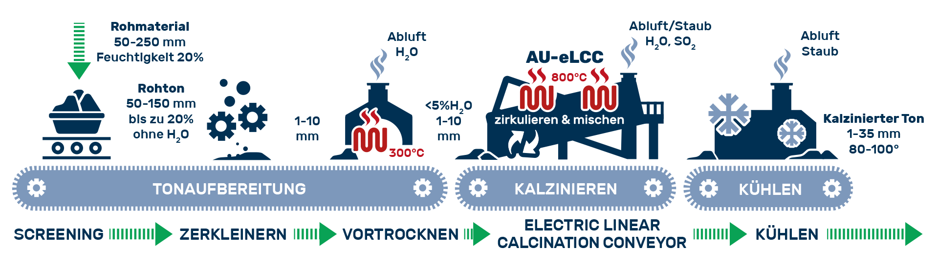 Aufbauend auf mehr als zwei Jahrzehnten Expertise in der Förderung heißer Materialien – einschließlich bewährter Lösungen wie dem KZB-S (bis 1.000°C), BZB-H-I (bis 850°C) und FPB-K (bis 850°C) – hat AUMUND, zusammen mit Holcim, den eLCC speziell für die effiziente Tonkalzinierung entwickelt.