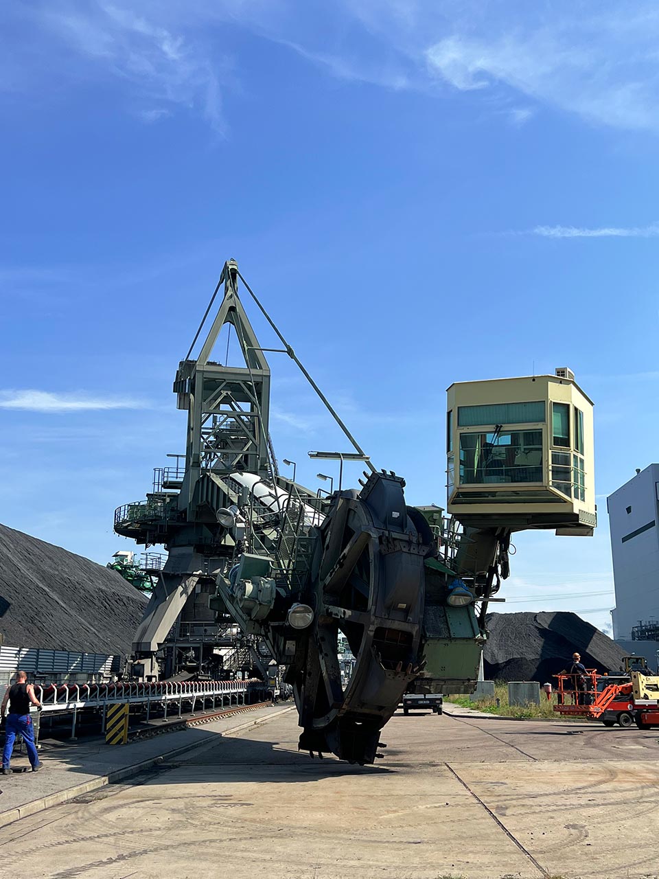 Die mechanische und elektrische Inbetriebnahme bis Oktober folgt den kundenseitigen Arbeiten an Gurtförderband, den eigentlichen Bauarbeiten und dem Energieversorgungssystem. Auf dem Boden montiert, wird der SCHADE Abwurfwagen in seine finale Position auf die Räder des Transportbandes unter dem Hallendach gehoben.