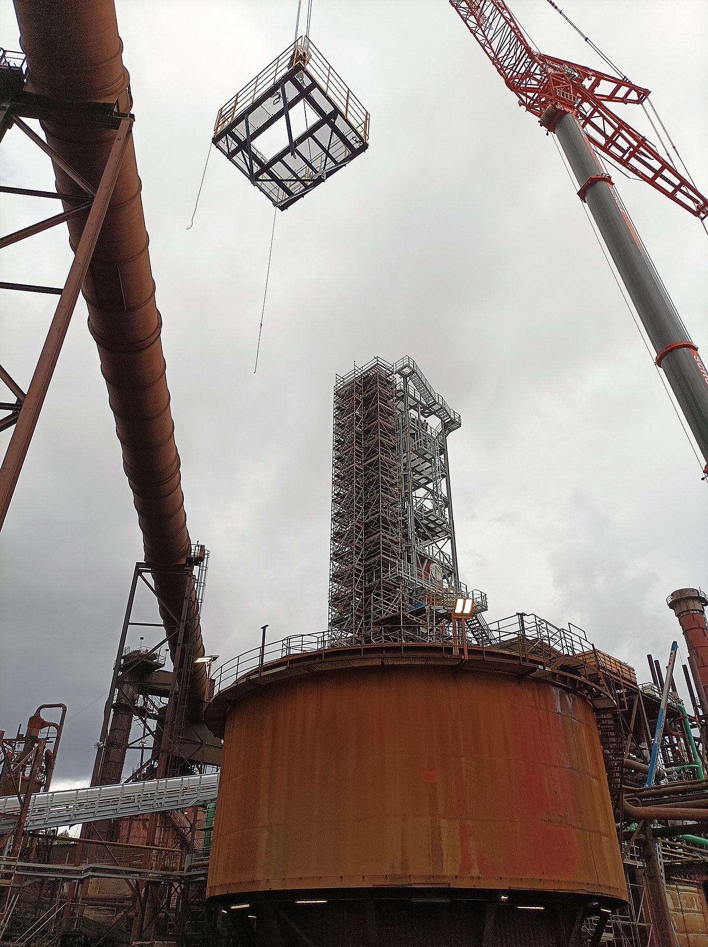 And the story continues: 55 years later the bucket elevator with a conveying height of approx. 49 m and a capacity of 200 tph has been installed for shaft furnace charging. Originally the space was designed for the existing skip conveyor, which is replaced by the bucket elevator. AUMUNDs proven track record of expertise in Hot Material Conveyors for Direct Reduction Pants convinced the operator of the bucket elevator concept.